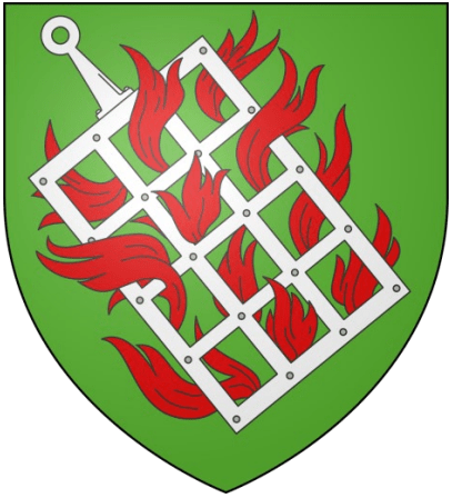 « De sinople au gril d’argent posé en bande, enflammé de gueules, le manche vers le chef. »